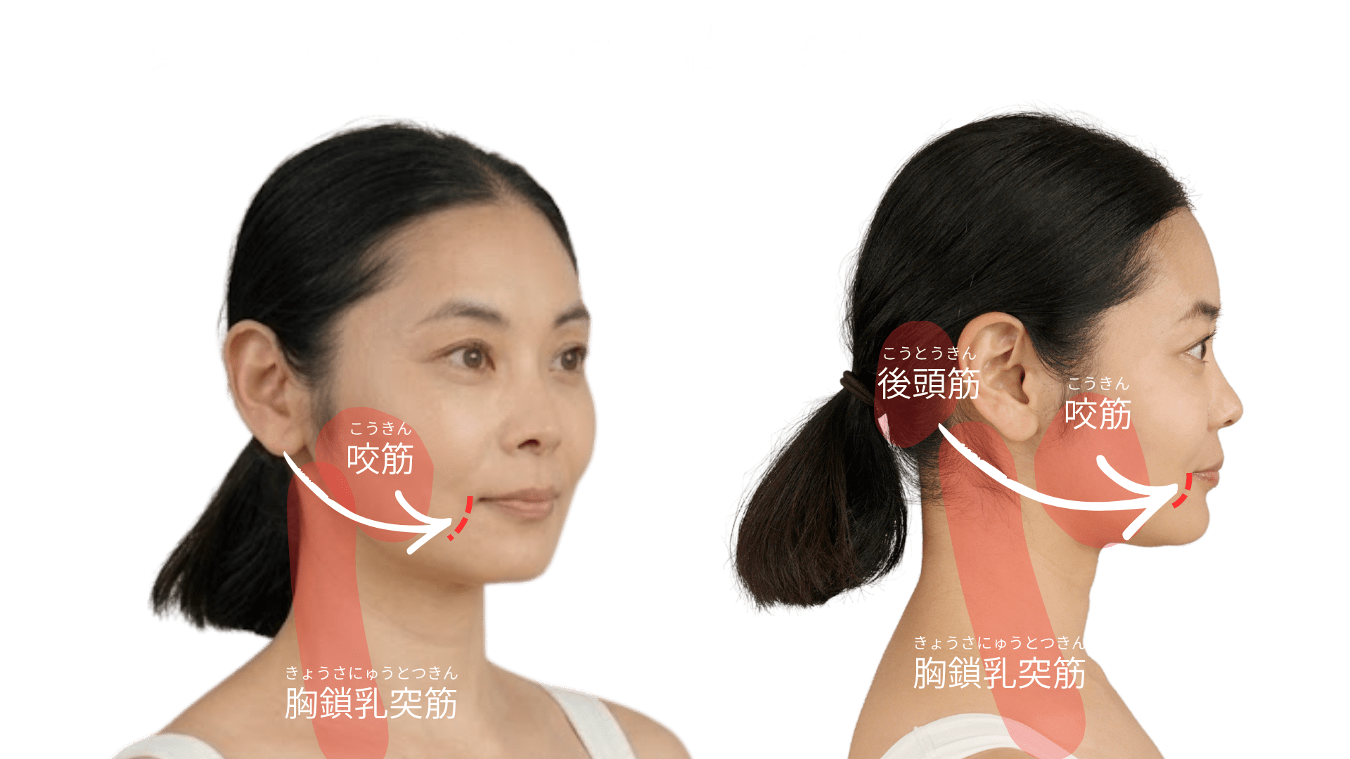 首のコリや食いしばりが、 見た目印象に影響する場合があります。