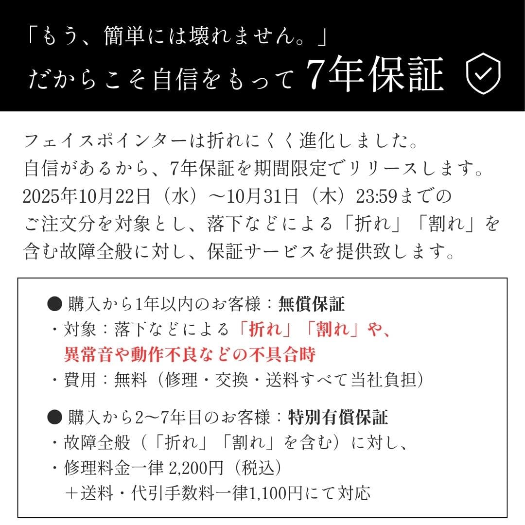 本キャンペーン期間中(2025年10月22日~31日まで)に限り、ご購入時期にかかわらず、「フェイスポインター系全般」の故障(「折れ」「割れ」を含む)でお困りの場合は、上記「ご購入から2年~7年以内」の保証内容(修理料金一律 2,200円+送料等1,100円)にて、修理または交換対応を承ります。